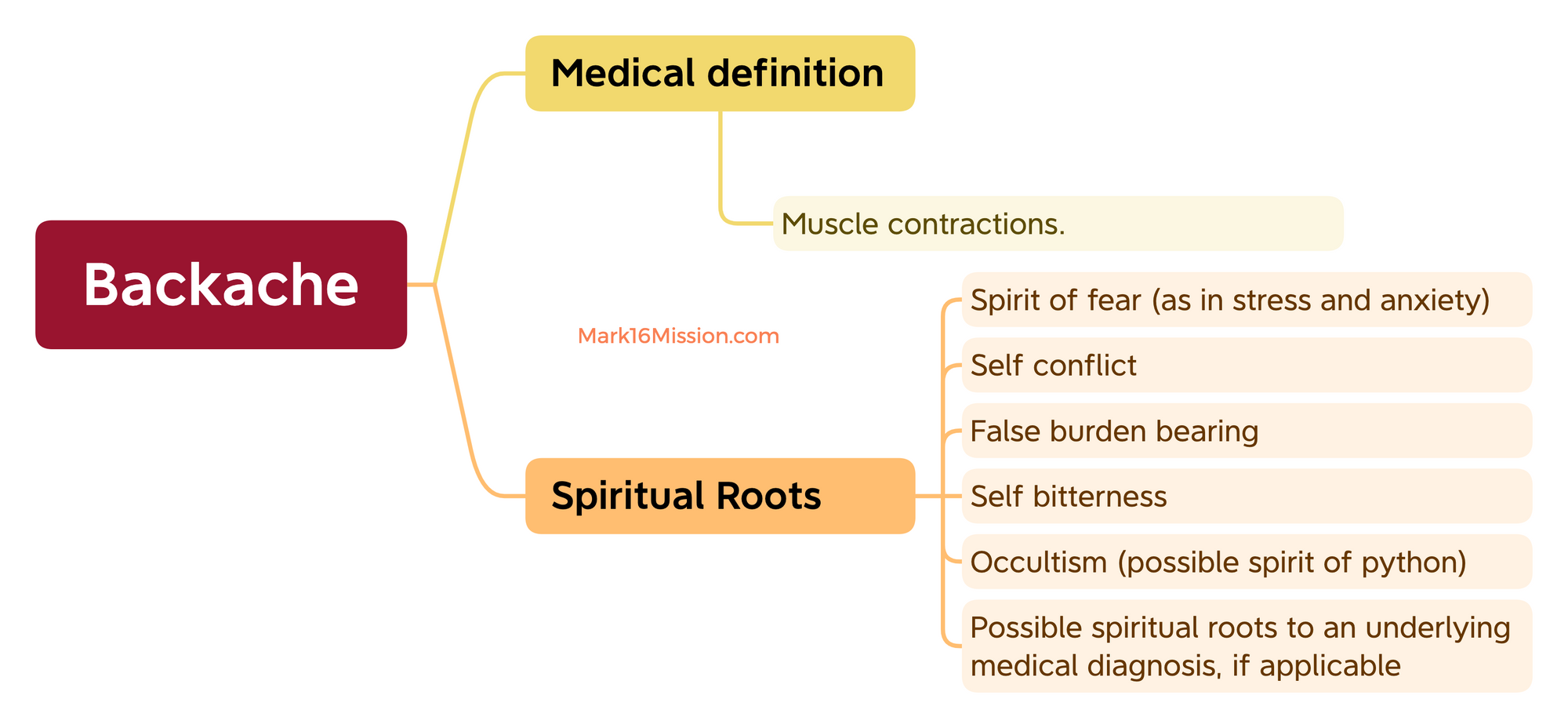 Spirit of fear (as in stress and anxiety); self conflict; false burden bearing; self bitterness; occultism (possible spirit of python); possible spiritual roots to an underlying medical diagnosis, if applicable.