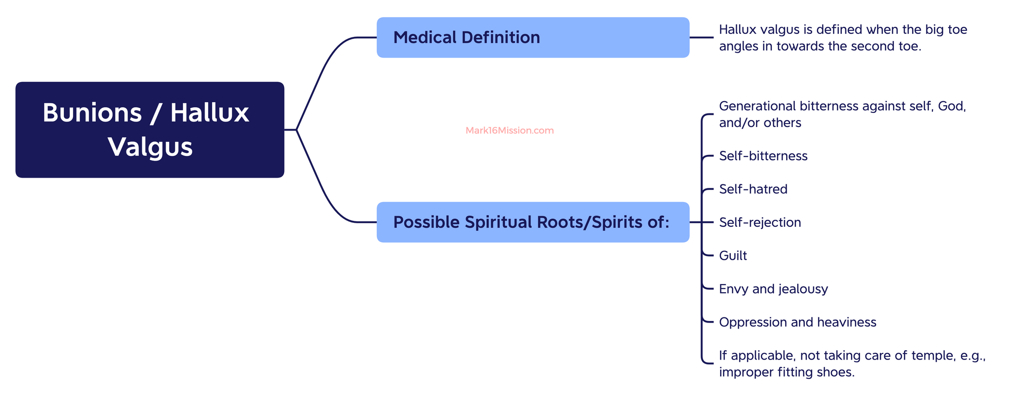 Spirits of: generational bitterness against self, God, and/or others; self-bitterness, self-hatred, self-rejection, and guilt; envy and jealousy; oppression and heaviness. If applicable, not taking care of temple, e.g., improper fitting shoes.