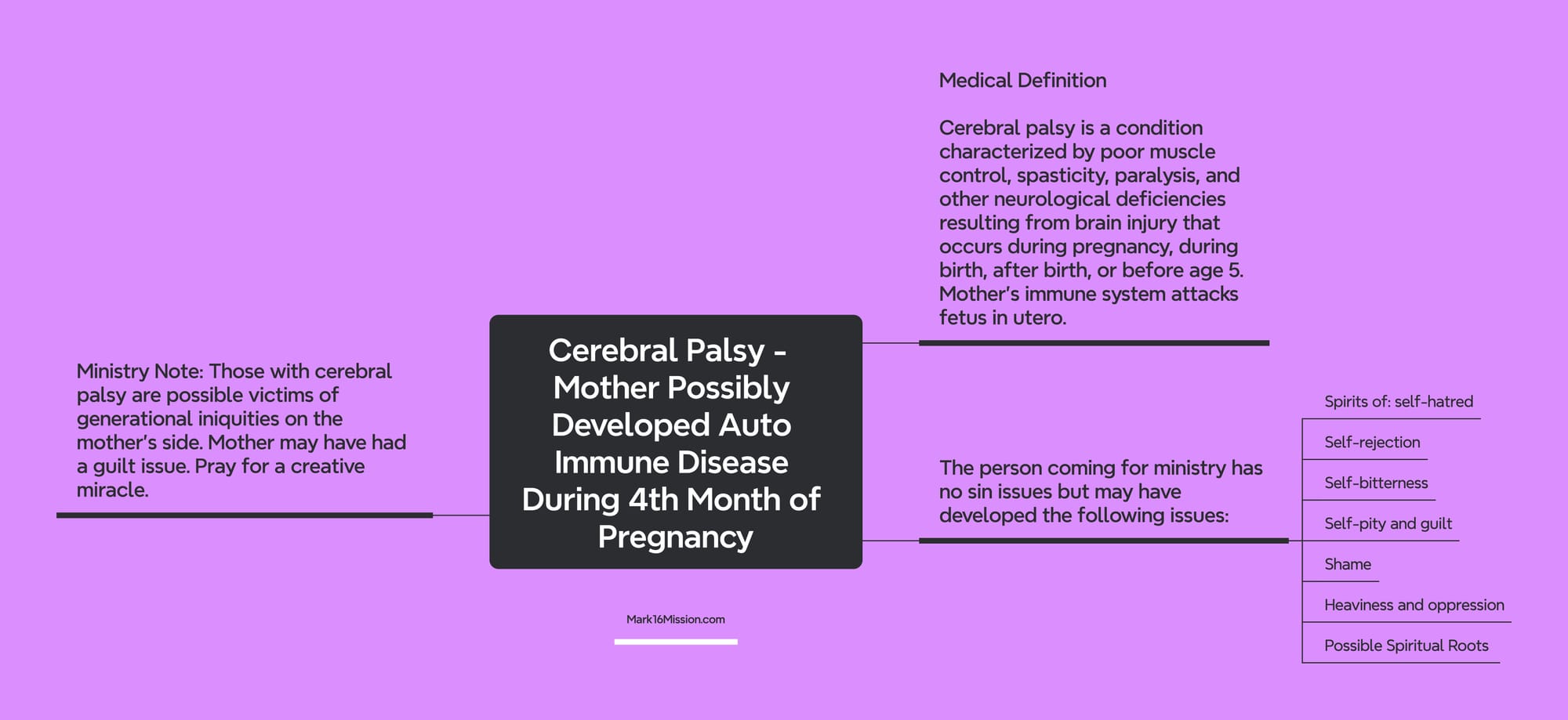 Note: Those with cerebral palsy are possible victims of generational iniquities on the mother’s side. Mother may have had a guilt issue. Pray for a creative miracle.