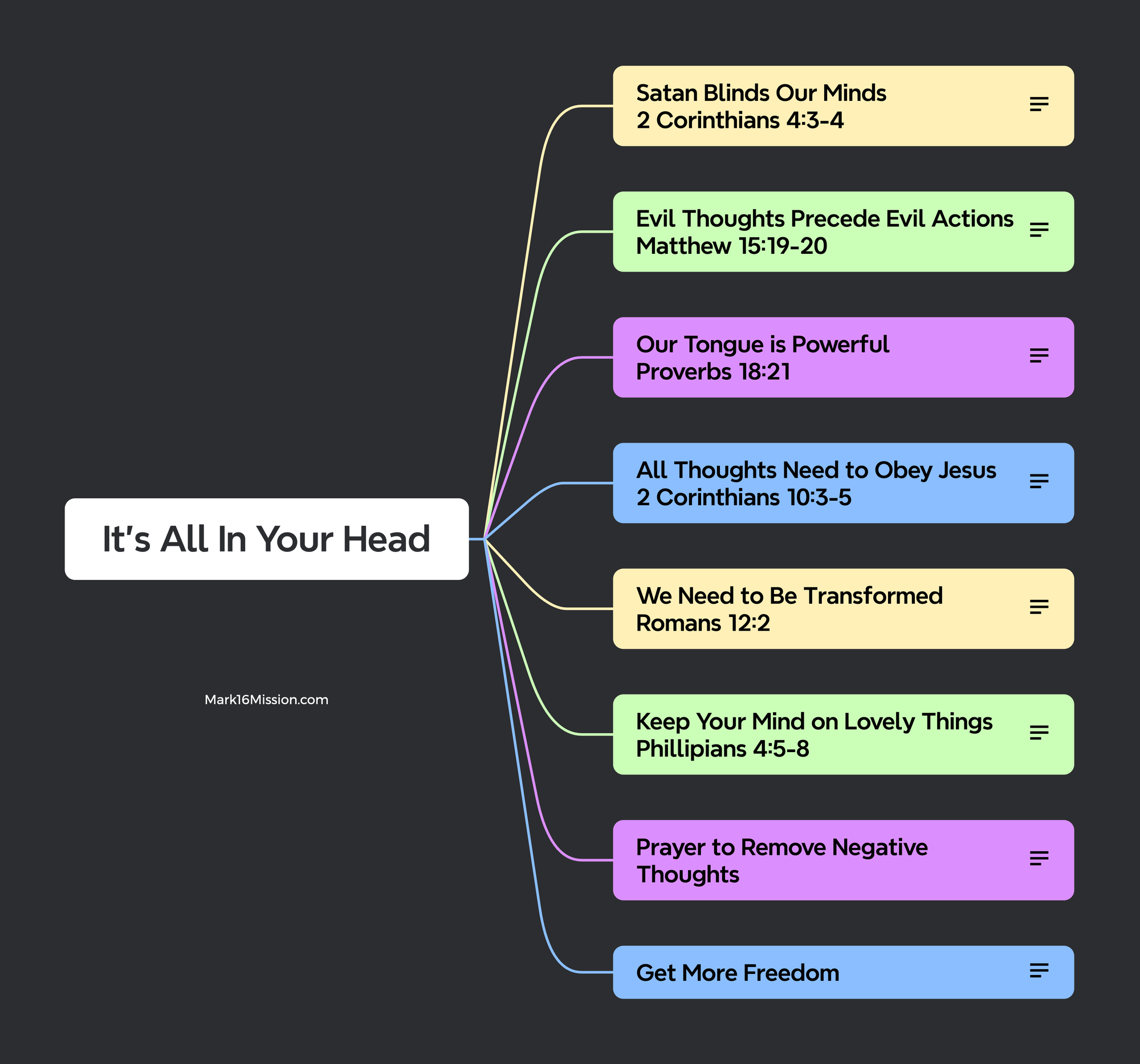 Reflection: Engage in spiritual warfare through prayer, targeting the strongholds in your mind. Practice 'taking captive every thought/emotion’ and submit your mental battles to Christ.